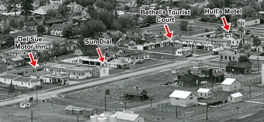 Later it became the Canyon Motel. The circular layout of cabins seen in the postcard and also shown in this 1958 aerial photo has survived.