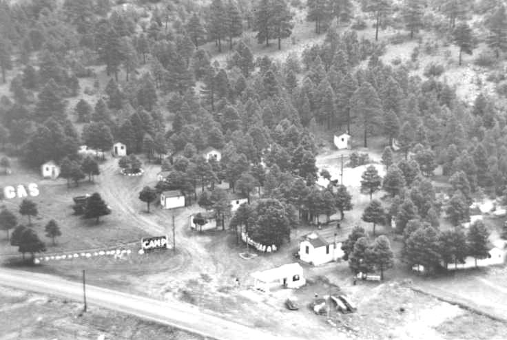 This was the location of the "Grand Canyon Court and Station" owned by Hubert Clark. He ran a Mobil gas station and owned cabins in the pines -see picture below, click on it for full sized view. Later it was operated by Mr. Gribbs and had 42 cabins. It was torn down in 1957 to make room for the Thunderbird Inn.