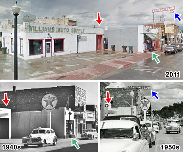 Next door, at 321 E Bill Williams is the site of the Williams Motel, it had a lineal lay out and according to the 1931 Sanborn map had 6 units. Now it is still open as the Drover's Inn Bed and Breakfast with Wild West themed rooms. Below is a "Then and Now" set of pictures looking west along Route 66, the red arrow marks the gable roof of Rod's and the blue one marks the motel's office.