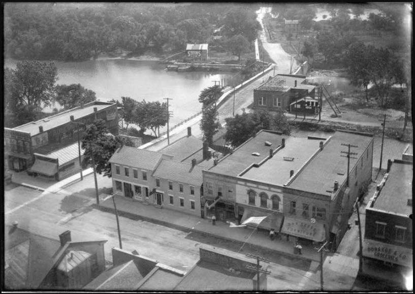 Continue westwards along Route 66, parallel to Water Street (and giving it its name) is a narrow branch of the Kankakee River known as the millrace. Cox built a dam on its northern tip to allow the water into it from the main river and used this current of water to turn the water wheel at his mill. Water powered grist mills, flour mills or sawmills to produce meal, flour and cut timber. Alden's Island or South Island is located west of the millrun. The old dam was damaged by floods in the 1990s.