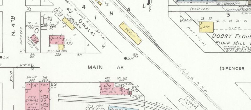 The thumbnail map (click on image to enlarge) was published by Sanborn Map Co. in 1943. shows the area where Route 66 crosses the tracks. The highway runs left to right, the tracks diagonally across the image. You can see the now gone Rock Island Railroad depot (yellow building) on the north side of the highway, and to the left, also in yellow, the "Interurban Depot".